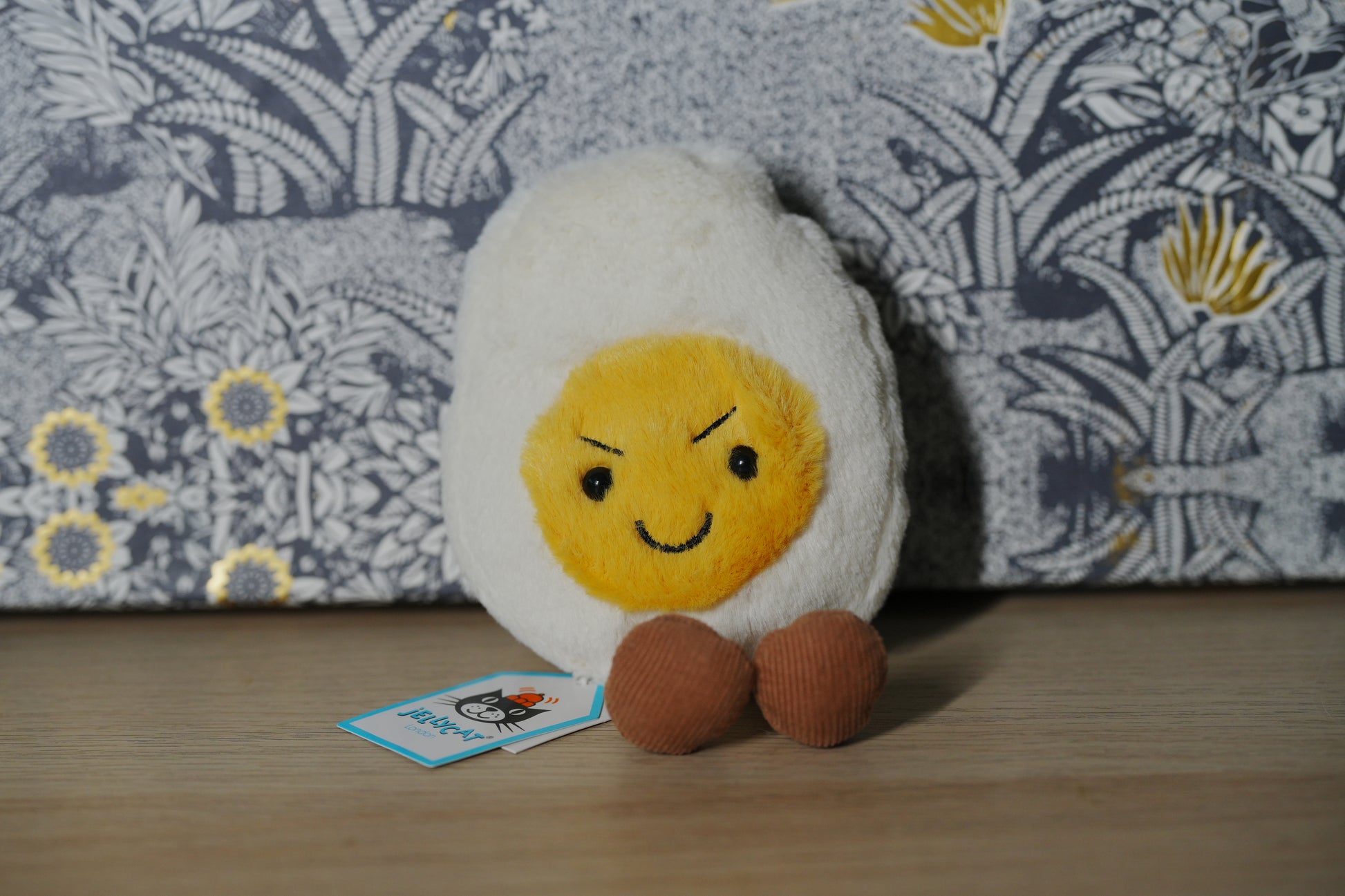 Amuseables Boiled Egg Cheeky is up to mischief, with a naughty look on that soft, fuzzy face! Squidgy and silly in white and yellow fur, with chunky, cordy toast-brown booties, this pocket pal brings picnic energy!